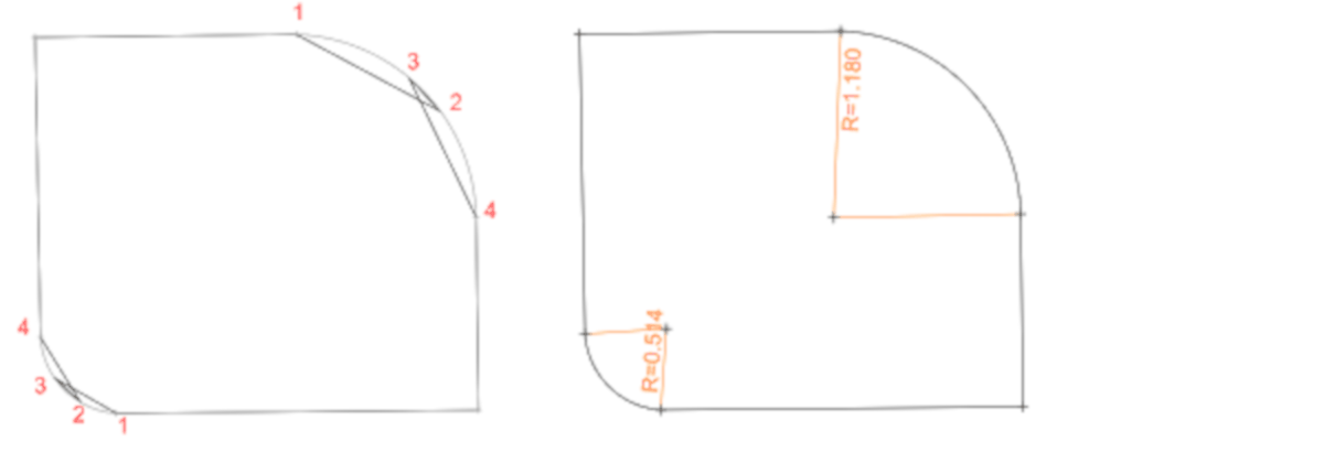 Voit mitata kolmen pisteen kaaren käyttäen ns. geokoodausta. Mittaa kaaren alkupiste (1) ja kaaren kehäpiste (2). Mittaa kolmas piste siten, että palaat takasin vähintään 20 cm. Mittaa vielä lopuksi kaaren loppupiste. Toiminto muuntaa tämän kolmen pisteen kaareksi poistamalla pisteen 3 ja laskemalla kaaren pisteiden 1, 2 ja 4 kautta.