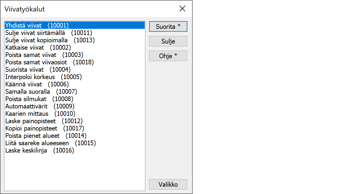 ViivatyökalutTyökalutoimintoja viivojen käsittelyyn. Toiminnot käsittelevät vain aktiivisen tiedoston viivat tai sen valitut viivat. Viiva on valittu, jos sen yksikin piste on valittu ryhmään.