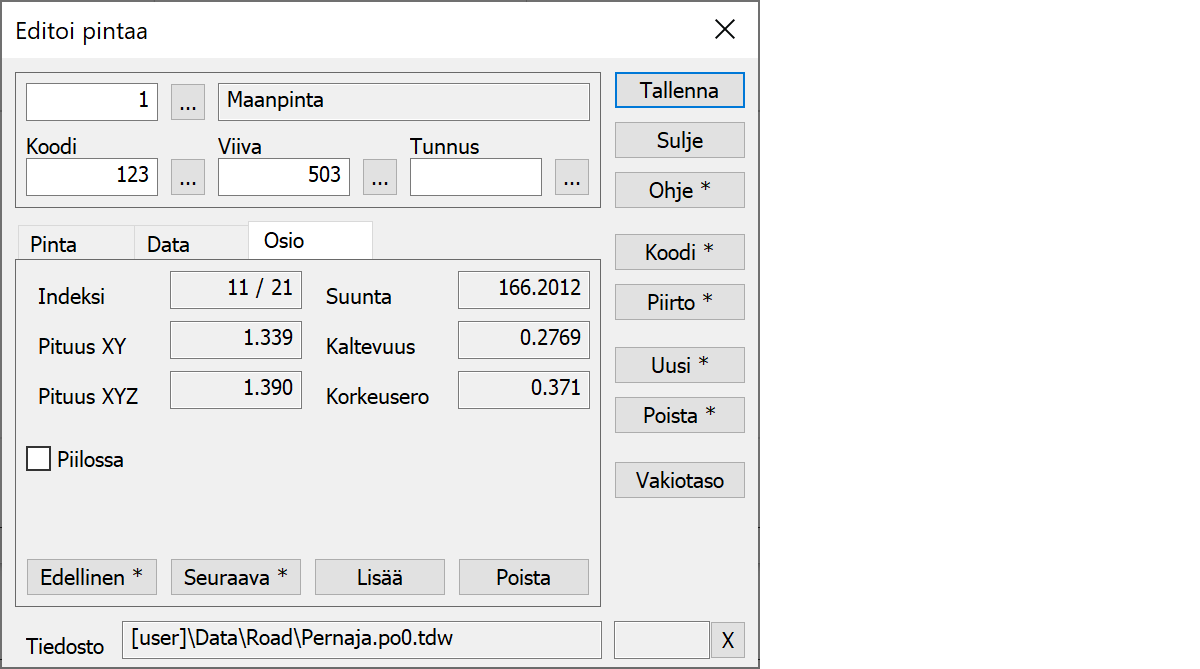 Editoi pintaaAktiivisen pinnan editointi. Editoitavaksi pinnaksi aktivoituu hiiren klikkausta lähinnä oleva pinta ja sen aktiiviseksi osioksi lähin osio. Jos osoitetaan pintaa päiden ulkopuolelta, aktivoidaan vain päätepiste. Editoitava pinta näytetään editointivärillä ja sen alku- ja loppupäähän piirretään pystysuorat viivasymbolit. Editoitavasta pinnasta näytetään myös mahdolliset piilotetut osiot ja aktiivinen pisteväli näytetään eri värillä. Aktiivinen piste on aktiivisen osion loppupiste.