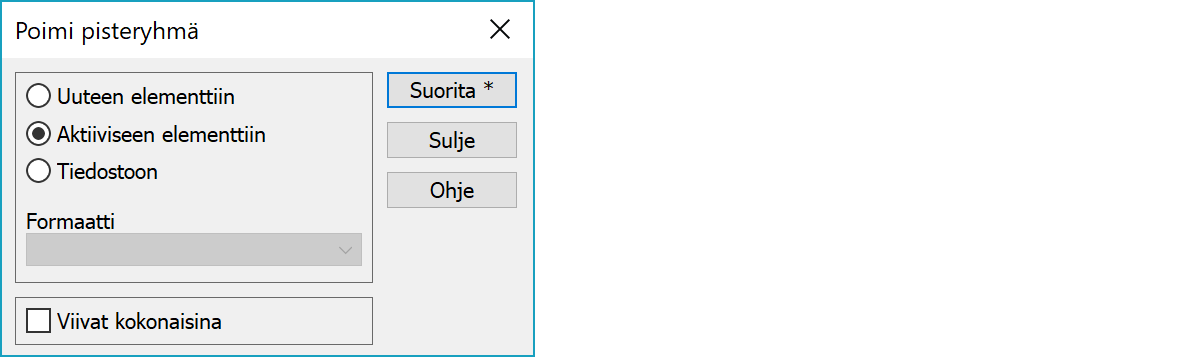 Voit kopioida pisteet joko Uuteen elementtiin, Aktiiviseen elementtiin tai Tiedostoon. Jos kopioit tiedostoon, valitse listalta formaatti ja anna tulostiedoston nimi OK-komennon jälkeen.
