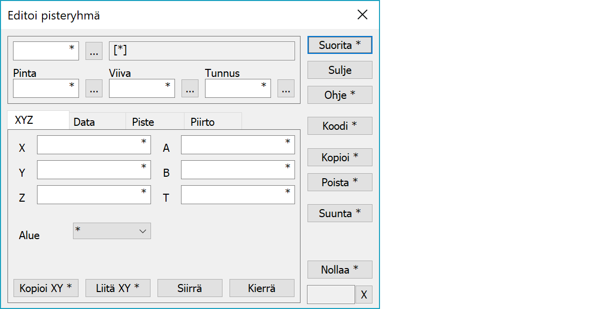 Editoi ryhmäRyhmään valittujen pisteiden tietojen muuttaminen. Toiminnon suorittaminen käy läpi kaikki valitut pisteet ja muuttaa niiden ne koordinaatit ja ominaisuudet, joille on annettu jokin muu arvo kuin tähti (*). Data-välilehdellä annetut ominaisuudet tallentuvat hajapisteille ja viivoille. Piste-välilehdellä annetut ominaisuudet tallentuvat sekä haja- että viivapisteille. Viiva katsotaan valituksi, jos yksikin sen piste on valittu.