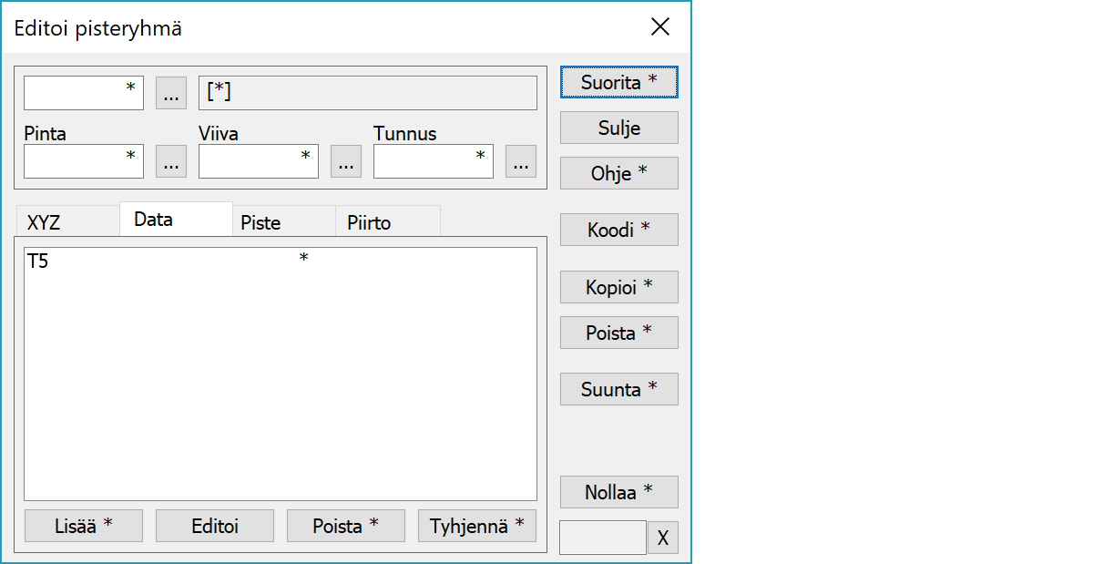 Editoi ryhmäRyhmään valittujen pisteiden tietojen muuttaminen. Toiminnon suorittaminen käy läpi kaikki valitut pisteet ja muuttaa niiden ne koordinaatit ja ominaisuudet, joille on annettu jokin muu arvo kuin tähti (*). Data-välilehdellä annetut ominaisuudet tallentuvat hajapisteille ja viivoille. Piste-välilehdellä annetut ominaisuudet tallentuvat sekä haja- että viivapisteille. Viiva katsotaan valituksi, jos yksikin sen piste on valittu.