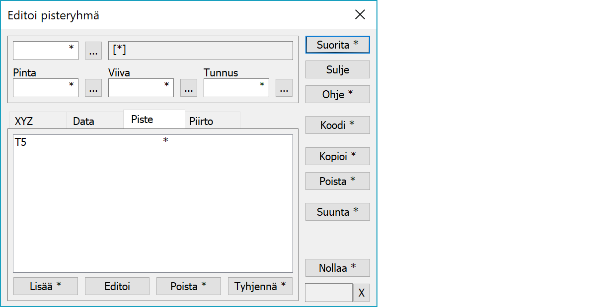 Editoi ryhmäRyhmään valittujen pisteiden tietojen muuttaminen. Toiminnon suorittaminen käy läpi kaikki valitut pisteet ja muuttaa niiden ne koordinaatit ja ominaisuudet, joille on annettu jokin muu arvo kuin tähti (*). Data-välilehdellä annetut ominaisuudet tallentuvat hajapisteille ja viivoille. Piste-välilehdellä annetut ominaisuudet tallentuvat sekä haja- että viivapisteille. Viiva katsotaan valituksi, jos yksikin sen piste on valittu.