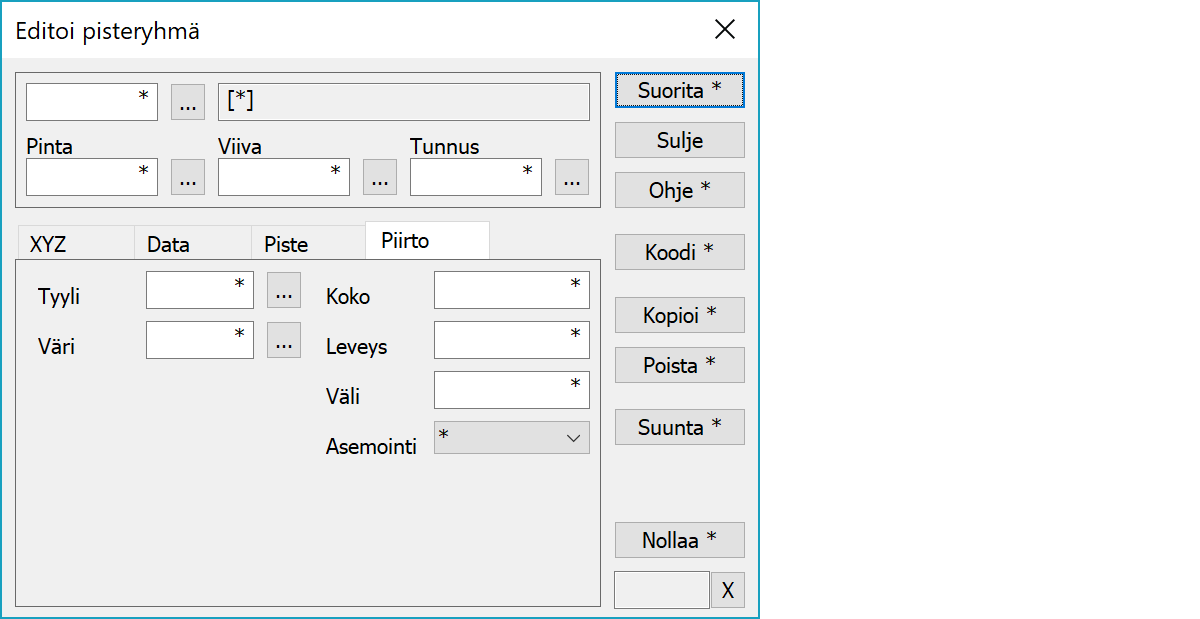 Editoi ryhmäRyhmään valittujen pisteiden tietojen muuttaminen. Toiminnon suorittaminen käy läpi kaikki valitut pisteet ja muuttaa niiden ne koordinaatit ja ominaisuudet, joille on annettu jokin muu arvo kuin tähti (*). Data-välilehdellä annetut ominaisuudet tallentuvat hajapisteille ja viivoille. Piste-välilehdellä annetut ominaisuudet tallentuvat sekä haja- että viivapisteille. Viiva katsotaan valituksi, jos yksikin sen piste on valittu.