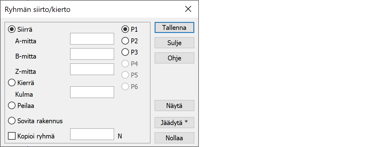 Ryhmän siirto / kiertoPisteryhmän siirto, kierto pisteen ympäri tai peilaus viivan yli. Sovita rakennus -toiminto laskee rakennuksen paikan kahta rajalinjaa käyttäen.