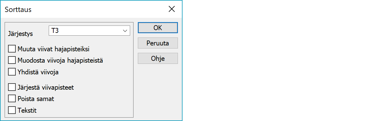 SorttausAktiivisen tiedostoelementin (vektori- kai kairaustiedosto) pisteiden sorttaus haluttuun järjestykseen. Toiminnolla voi myös pilkkoa taiteviivat hajapisteiksi tai päinvastoin.