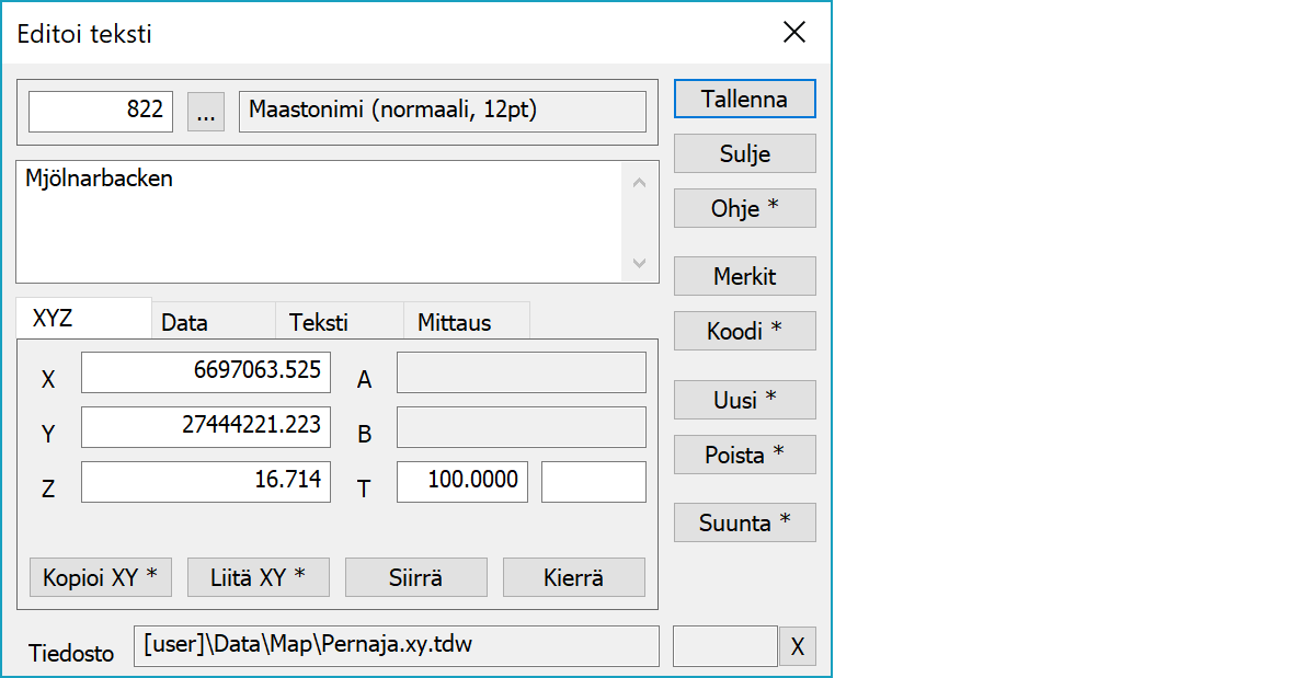 Tekstin koordinaatit ja kulma. Kulman T perässä oleva toinen kenttä on mahdollinen pystykulma välillä -100 - 100 gon.