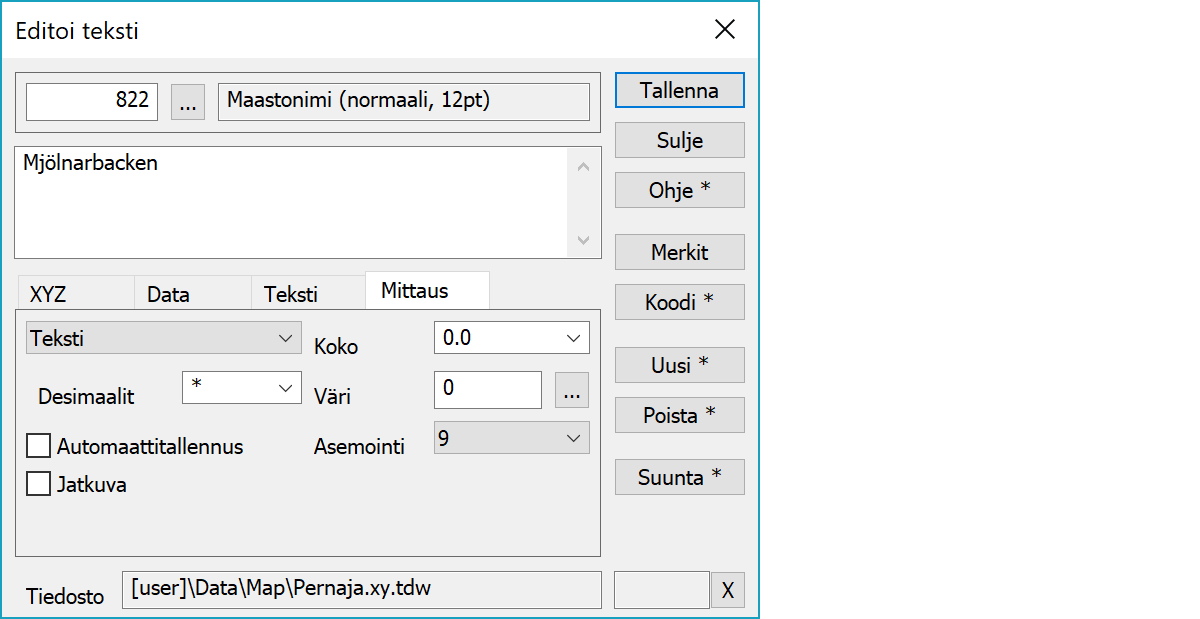 Valitsemalla automaattitallennuksen, ei Tallenna-nappia tarvitse painaa tallentaaksesi tekstin. Viivan kaikille pisteille saat välimatkan asettamalla päälle Matka-, Jatkuva- ja Automaattitallennus-asetukset sekä valitsemalla hakutavaksi Taiteviiva.
