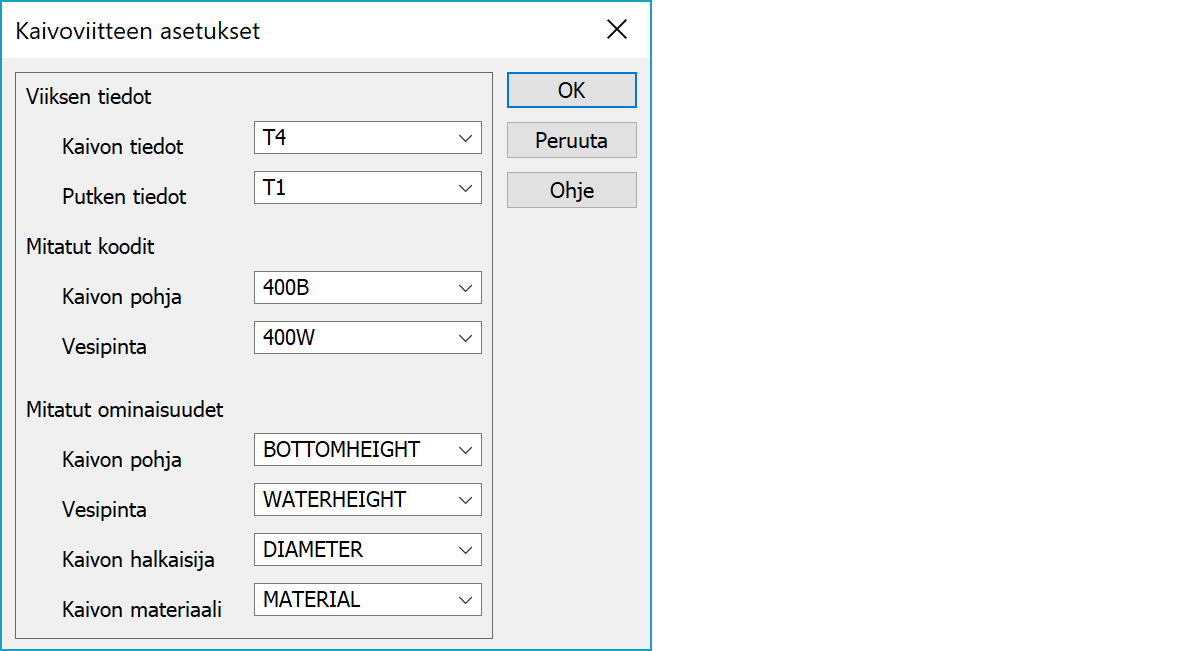 Kaivon tiedot on lähtevän viiksen päälle kirjoitettava kaivon tieto. Pilkulla erotettu lista kaivon ominaisuuksista, esimerkiksi T4,DIAMETER. Oletuksena T4-kentän tieto (kaivon numero).