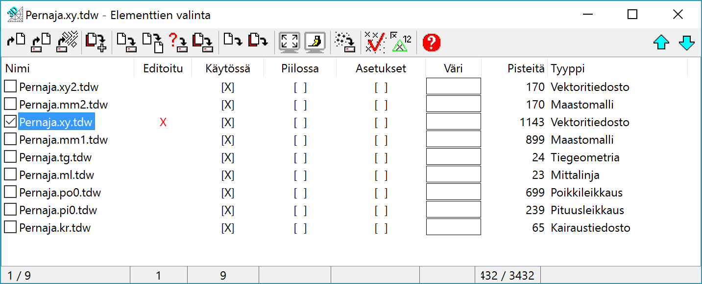Tiedostoelementtien valintaElementtilistaa käytetään ohjelman tiedostojen hallintaan. Listassa näytetään kaikki ikkunaan luetut tiedostot ja sen avulla voidaan tiedostojen asetuksia ja esitystapaa muokata.