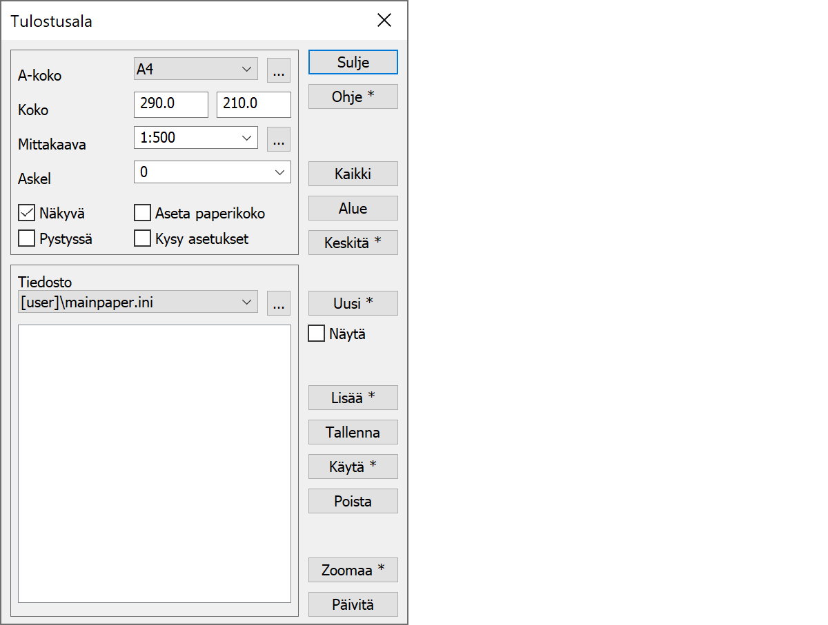 Tiedostoa voidaan käyttää tallentamaan paperiasetukset ini-tiedostoon käyttäjän valitsemalla nimellä. Vain paperin koko, mittakaava, askel ja sijainti tallennetaan. Lista muistaa kymmenen viimeksi käytettyä tiedostoa ja selauspainikkeella tiedostoa voidaan vaihtaa. Alla oleva nimilista näyttää kaikki tiedostoon tallennetut paperiasetukset.