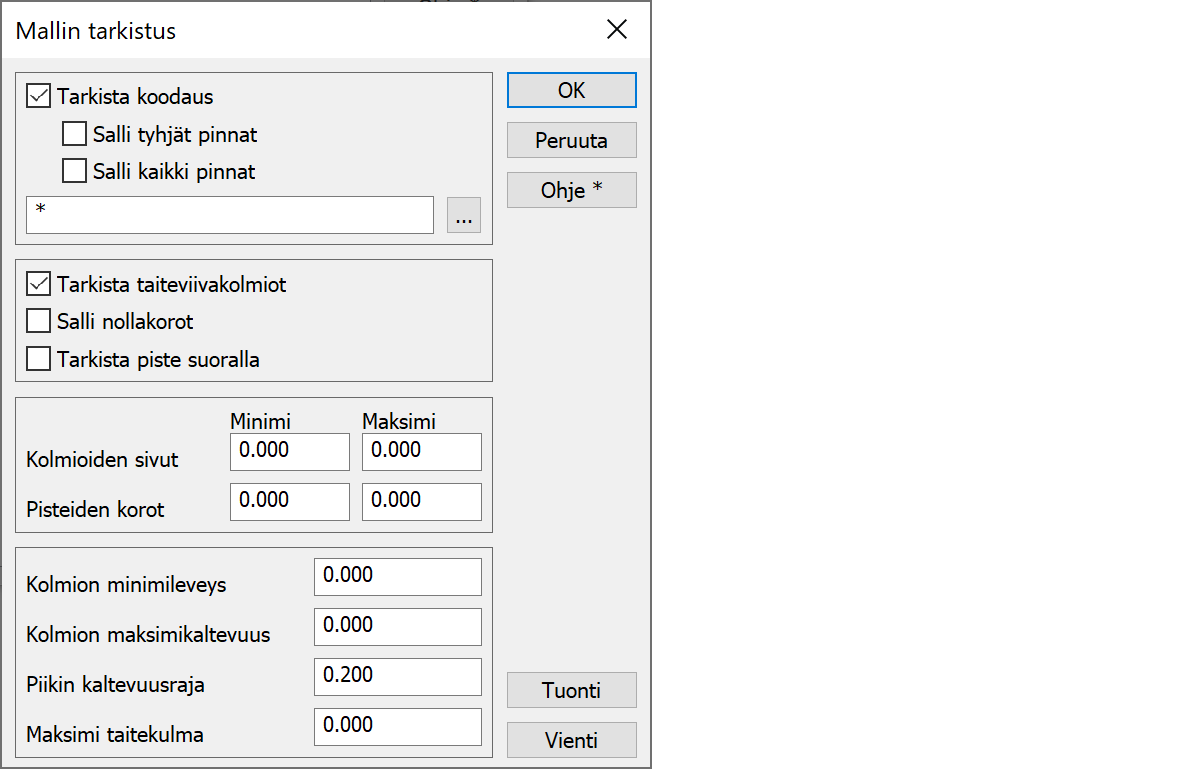 Tarkistaa pintatunnukset, joita ei löydy kooditiedostosta. Tyhjät pinnat tai kaikki pinnat voidaan erikseen sallia.