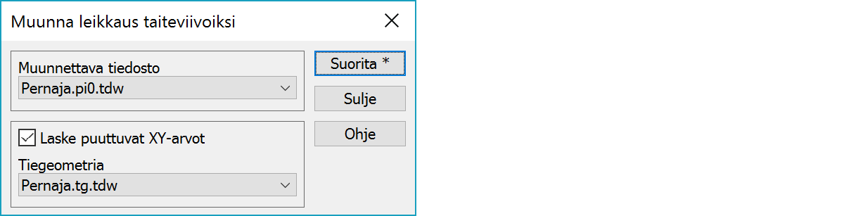 Muunna poikki/pituusleikkaus taiteviivaksiMuuntaa poikki- tai pituusleikkaustiedoston taiteviivaksi. Syntynyt tiedosto nimetään käyttäen alkuperäistä tiedostoa ja lisätään tiedostolistaan. Kaikki poikkileikkaukset talletetaan samaan tiedostoon.