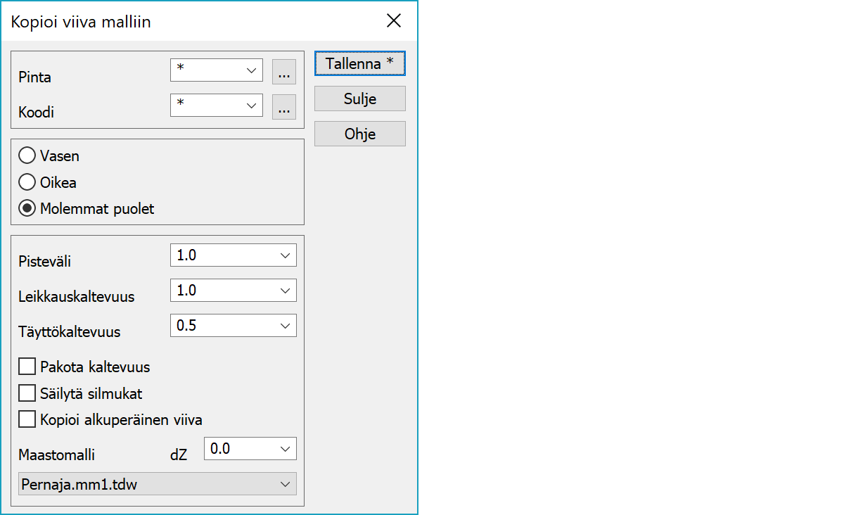 Leikkauskaltevuutta käytetään, kun kopioitava viiva on mallin alapuolella ja täyttökaltevuutta, kun viiva on mallin yläpuolella. Kaltevuuden etumerkillä ei ole väliä. Kopioituun viivaan lisätään automaattisesti pisteet kohtiin, jossa se leikkaa maastomallin.