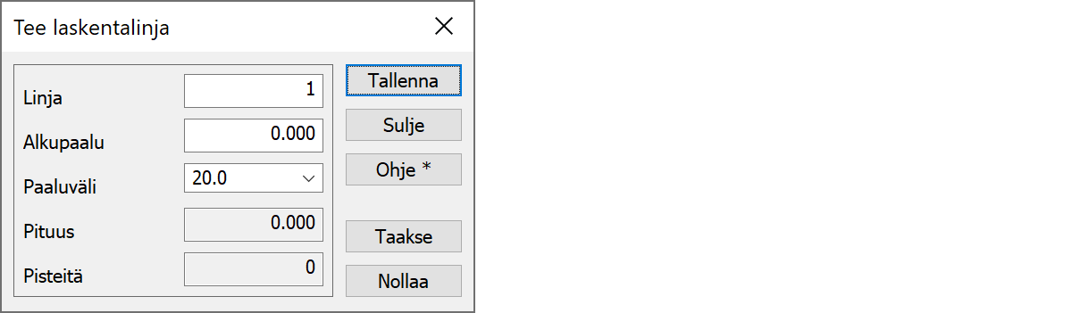 Laskentalinjan tekoLaskentalinja voidaan osoittaa käyttämällä normaaleja hakutapoja Hiiri, Piste tai Taiteviiva sekä näiden yhdistelmiä. Menussa näkyy osoitettujen pisteiden lukumäärä sekä linjan pituus. Anna haluttu paaluväli ja talleta, jolloin elementtilistaan syntyy uusi laskentalinjatiedosto. Tiedosto voidaan halutessa tallentaa levylle myöhempää käyttöä varten.