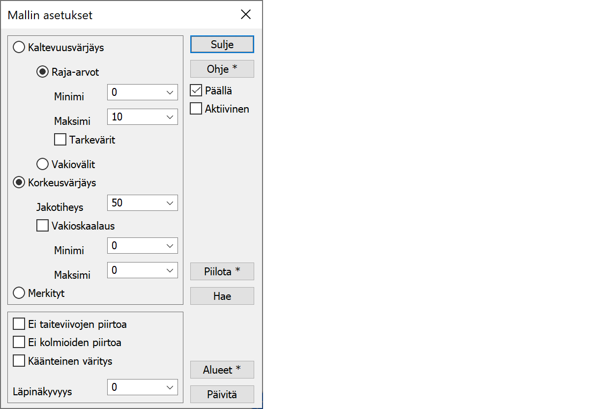 AsetuksetNämä maastomallin asetukset vaikuttavat kaikkien mallien ja neliöverkkojen piirtoon.