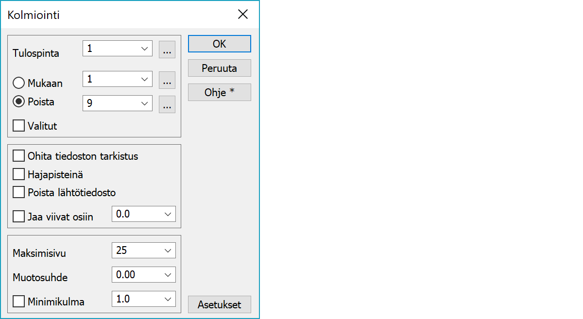 Ennen kolmiointia suoritettavan tiedoston tarkistuksen asetukset.