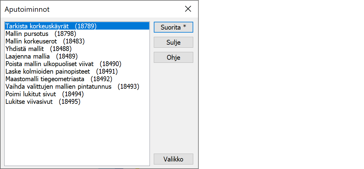 AputoiminnotErilaisia aputoimintoja, jotka valitaan listalta ja käynnistetään Suorita-näppäimellä.
