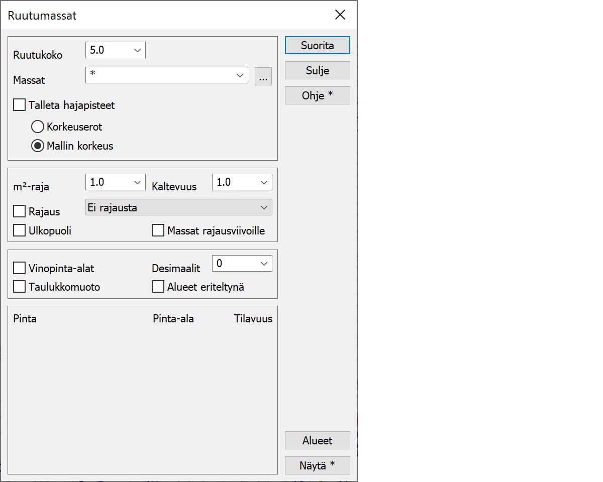 Laskee tulostiedostoon kaikkien pintojen vinopinta-alat. Pinta-ala lasketaan vain kyseisen pinnan massojen alueen yläpinnasta.