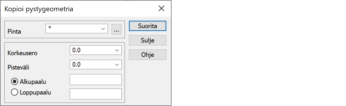 Kopioi pystygeometriaPystygeometrian kopiointi pituusleikkausprofiiliksi halutulla paaluvälillä. Kaaret muutetaan suoranpätkiksi paaluvälein.