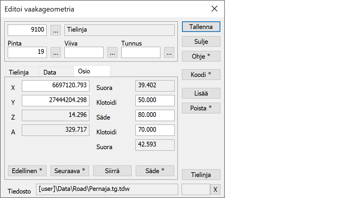 Vaakageometrian editointiTällä toiminnolla tehdään uusi tielinja valitsemalla aluksi Lisää-toiminto ja osoittamalla sen jälkeen hiirellä tielinjan huippupisteiden paikat murtoviivana. Editointi tapahtuu osoittamalla jotain linjan pistettä, jolloin ko. osio aktivoituu ja sen arvoja voidaan editoida. Yksittäinen osio koostuu kaaresta ja sen molemmin puolin olevista klotoideista.