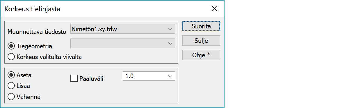Korkeus tielinjastaToiminto lisää tai vähentää tielinjan korkeuden vektoritiedostosta tai maastomallista.