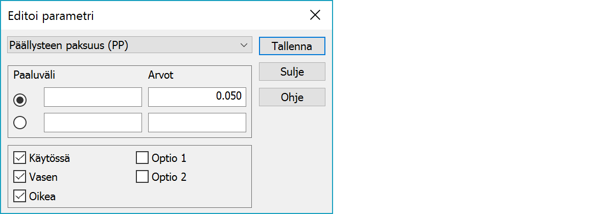 Paaluväli määrää, millä välillä parametrin arvot ovat voimassa. Mikäli väliä ei määritetä, ylempi arvo on voimassa koko tielinjan matkalla. Jos väli on määritetty, voidaan arvoiksi antaa alku- ja loppuarvo, joiden välillä arvo muuttuu lineaarisesti. Paaluväli voidaan myös osoittaa pääikkunasta hiirellä.