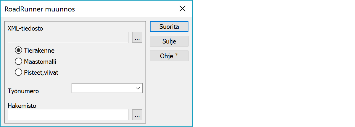 Muuntaa XML-tiedoston tietokantamuotoon käyttäen Leican RoadRunner-muunnosohjelmaa. Ohjelma on hankittava erikseen Leicalta.