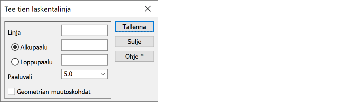 Laskentavälin alku- ja loppupaalut voidaan joko kirjoittaa näihin tai osoittaa hiirellä tielinjalta. Hiirellä osoitettaessa paaluluku pyöristetään lähimpään paaluvälin mukaiseen paalulukemaan. Mikäli paalulukemia ei anneta, käytetään oletuksina tielinjan alkua ja loppua.