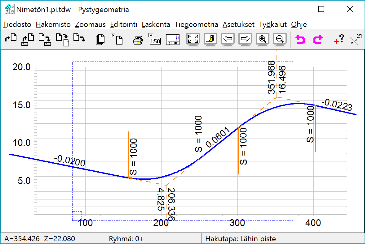 PystygeometriaikkunaPystygeometriaikkunassa on kaikki normaalit pituusleikkausikkunan toiminnot sekä lisäksi tien pystygeometrian käsittelytoiminnot. Koska vaaka- ja pystygeometria ovat samassa tiegeometriatiedostossa, ikkuna tarvitsee käynnistyäkseen pääikkunaan tämän tiedoston ja lukittuu siihen.