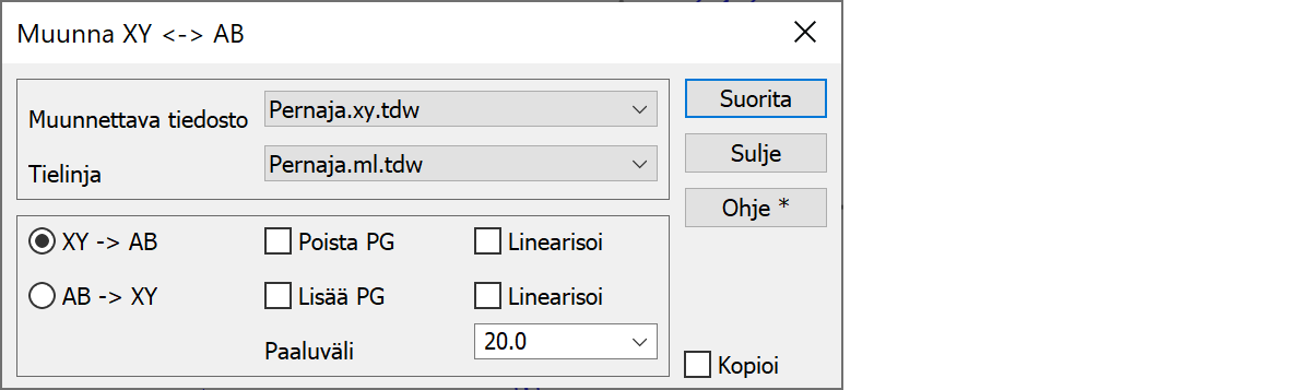 Muunnos paaluluvusta ja sivumitasta XY-koordinaateiksi. Jos painat Shift-Suorita, linearisoidaan AB-aineisto ennen muunnosta.