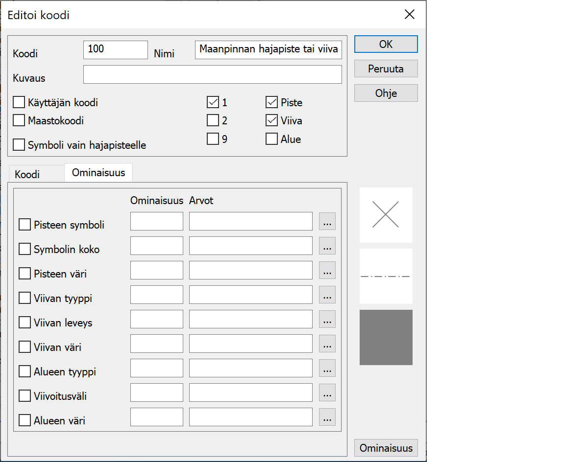Koodien ja piirtosääntöjen määrittely. Leveys ja kokoarvot annetaan joko paperimillimetreinä (positiiviset arvot) tai maastometreinä (negatiiviset arvot). Millimetreinä annetut koot tulostuvat paperille aina saman kokoisina, kun taas metriset koot skaalautuvat valitun tulostusmittakaavan mukaan.