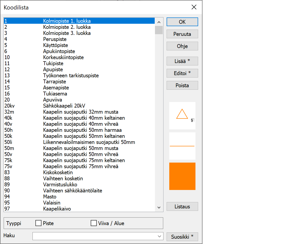 Listassa näkyvät ao. koodilistaan määritellyt koodit. Alareunan kentät näyttävät koodin symbolin sekä viiva- ja aluetyypin. Koodilista voidaan määrätä kentille T1 ja T3. Kentän T1 määrittelyt määräävät piirtosäännöt poikki- ja pituusleikkauskuvissa pintatunnuksen mukaan ja kentän T3 määrittelyt vastaavasti normaalikuvan piirtosäännöt koodin mukaan.