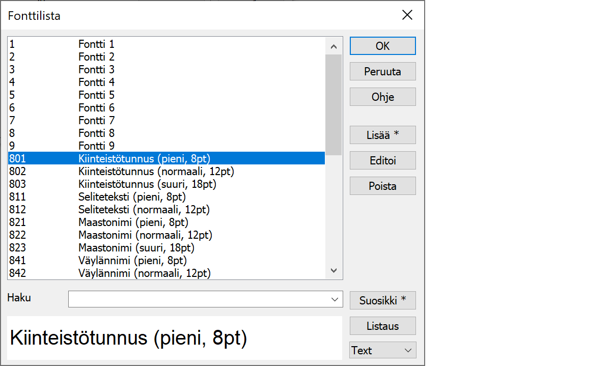 Listassa näkyvät kooditiedostoon määritellyt fontit. Tekstien editoinnissa voidaan antaa tekstille jokin tässä listassa määritelty koodi. Koodia käytetään piirtämiseen, mikäli tekstille ei ole erikseen määrätty piirtosääntöjä, sekä tekstien siirrossa toisiin järjestelmiin.