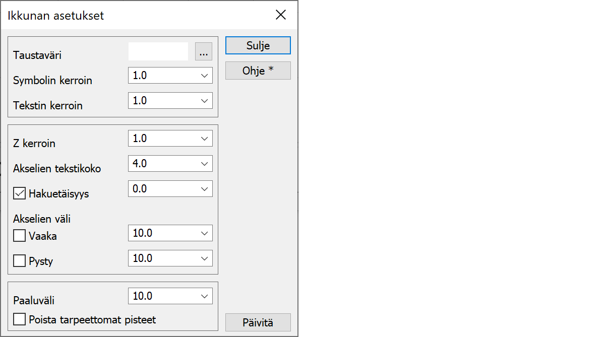 Jos rastit ovat päällä, akselien väli on lukittu annettuun metriarvoon. Muutoin akselien väli vaihtelee ikkunan (tai paperin) koon mukaan.