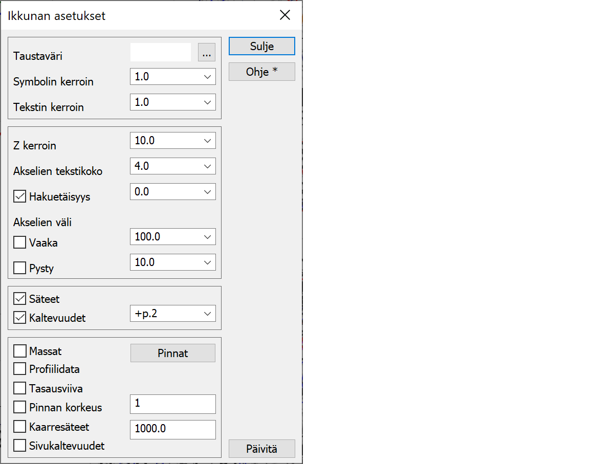 Annetun pinnan korkeuden näyttäminen kuvassa. Tarvitsee pääikkunaan lasketun pituusleikkauksen, josta korkeudet haetaan.