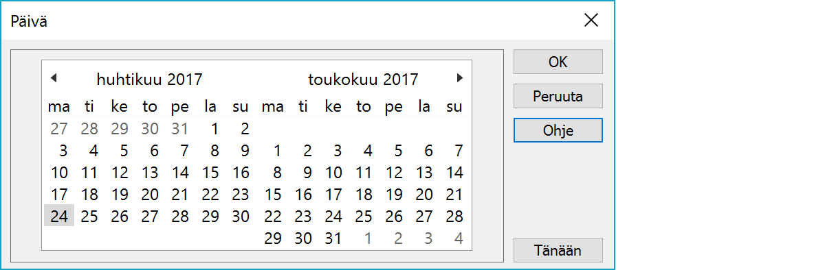Päivämäärän valinta. Kuukausi voidaan valita klikkaamalla otsikkona olevaa kuukauden nimeä ja vuosi voidaan valita sitten klikkaamalla otsikkona olevaa vuosilukua.