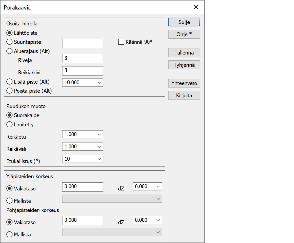 Toiminnolla voi suunnitella porakaavion käyttäen lähtöpistettä ja suuntaa tai taiteviivaa. Taiteviivan tapauksessa suuntapiste kertoo kummalle puolelle taiteviiva porakaavio sijoittuu.