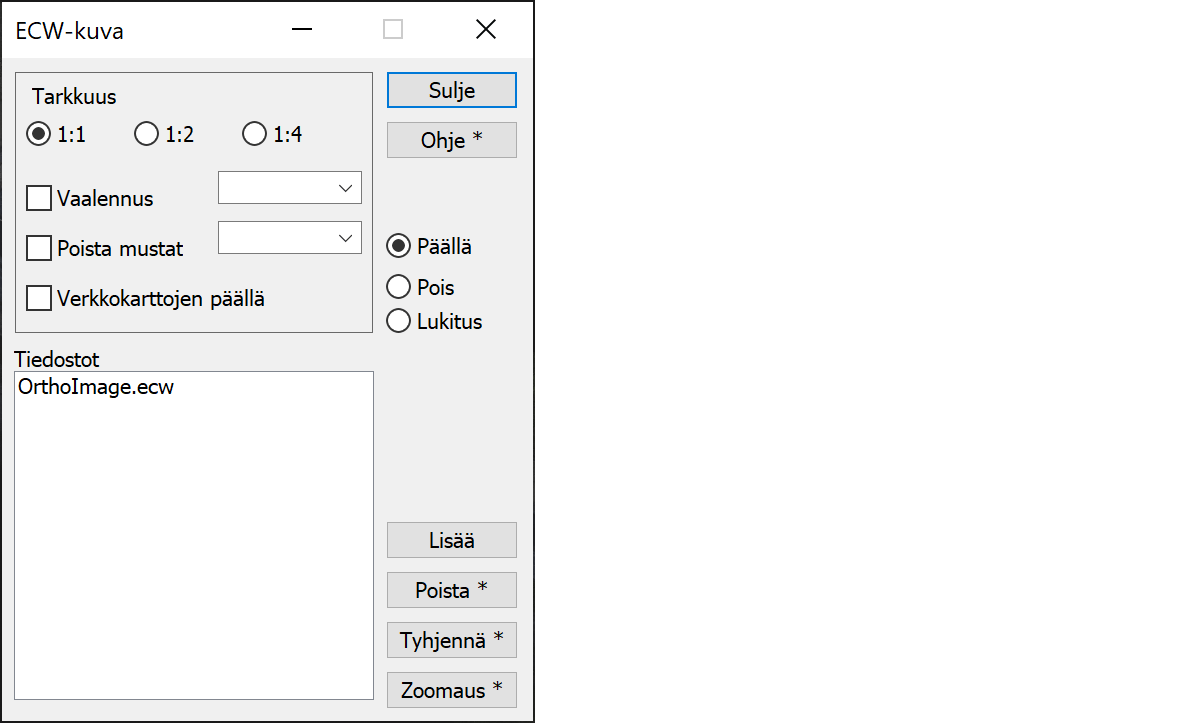 ECW-kuva piirretään verkkokarttojen päälle. Oletus on piirto verkkokarttojen alle.