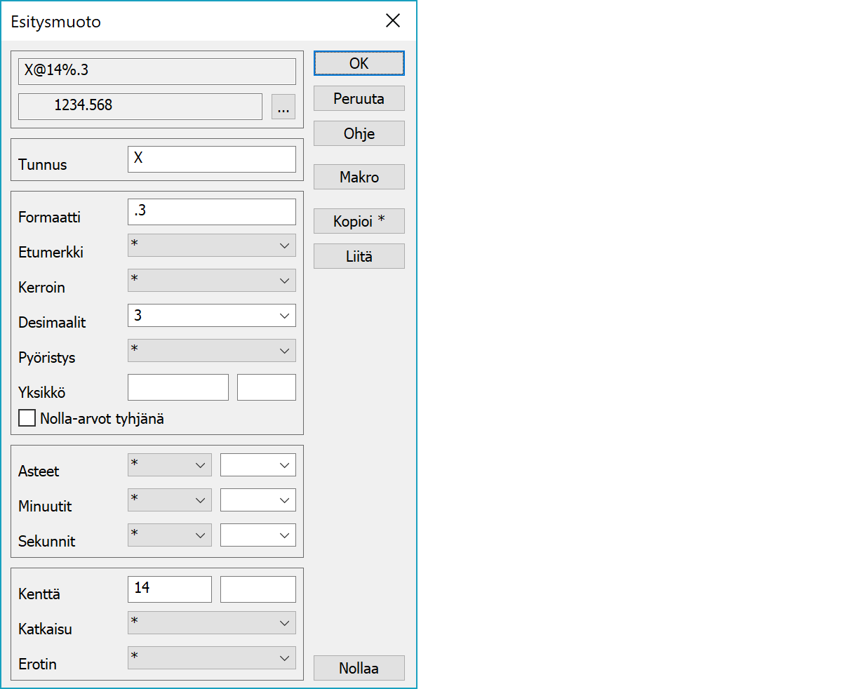 EsitysmuotoOminaisuuksien ja makrojen esitysmuodon editointi. Käytettävissä esimerkiksi valintalistan kautta Pisteen esityksessä ja Tekstiformaatissa.
