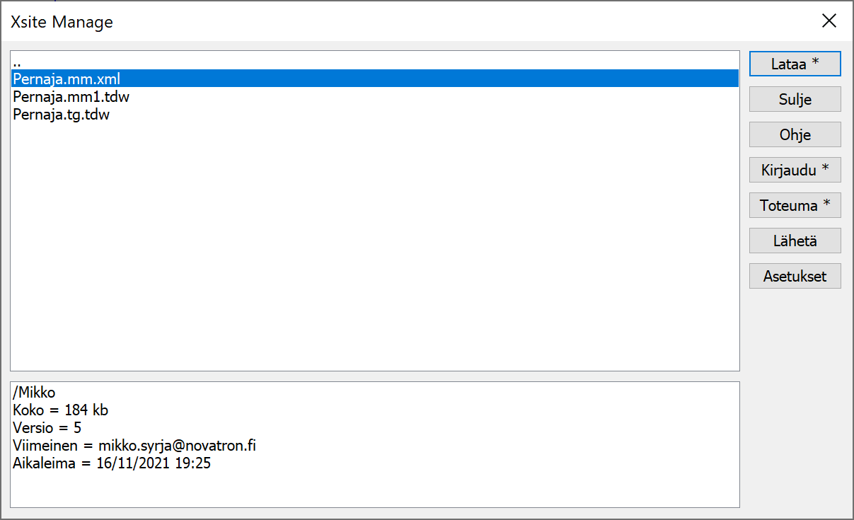 Lataa valittu tiedosto Xsite Manage -palvelusta. Tiedosto ladataan Manage-hakemistoon, jonka voi määritellä asetusten kautta.