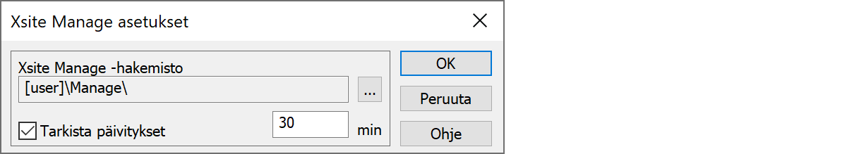 Työmaat tarkastetaan päivitysten varalta kun Xsite Manage -toiminto avataan. Tällä asetuksella voit säätää tehdäänkö tarkastusta ja kuinka kauan edellisestä tarkastuksesta tulee olla kulunut, että tarkastus tehdään. Tarkastusta ei tehdä jatkuvasti taustalla, vaan vain silloin kun toiminto avataan.