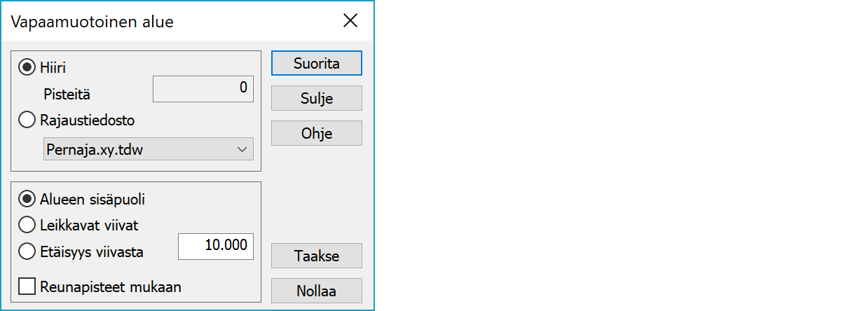Valitsee pisteet valitussa rajaustiedostossa olevien taiteviivojen avulla. Tämä haku tehdään aina XY-koordinaateilla riippumatta käytössä olevasta näyttötilasta. Alueen sisäpuolta haettaessa käytetään vain rajaustiedoston sulkeutuvia taiteviivoja.