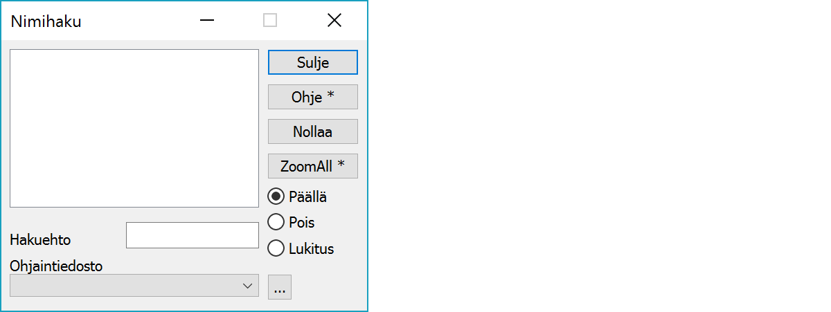 Kun kirjoitat tähän haettavan nimen alkukirjaimet, ohjelma hakee ensimmäisen löytyvän nimen ja näyttää sen listassa. Jos kentän alkuun antaa tähden (*), ohjelma hakee annettua tekstiä myös nimien keskeltä.