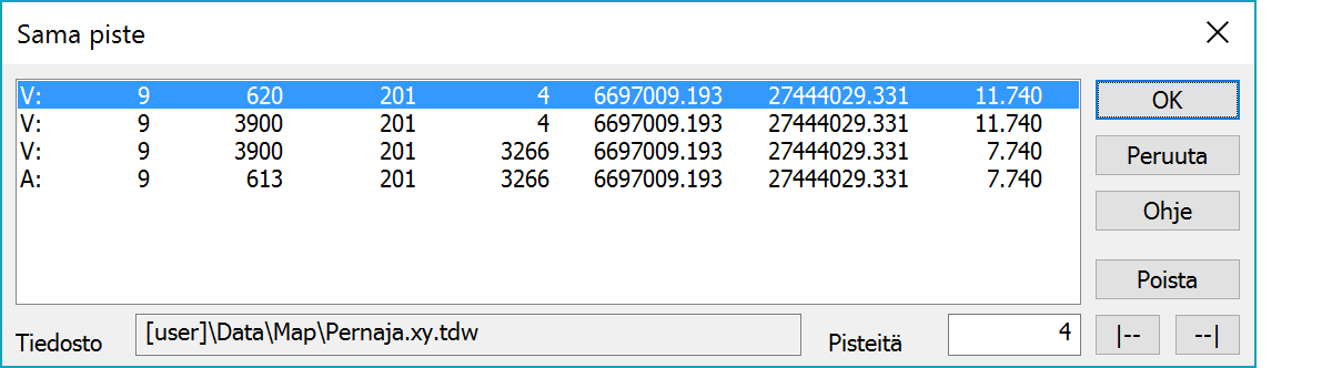 Tämä dialogi näytetään, jos aineistossa on useita samoja pisteitä samassa hiirellä osoitetussa kohdassa ja Samat pisteet -asetus on päällä. Valitse halutut pisteet ja paina OK. Jos valittuja pisteitä on useita, kaikki merkataan ryhmään ja viimeinen jää aktiiviseksi.