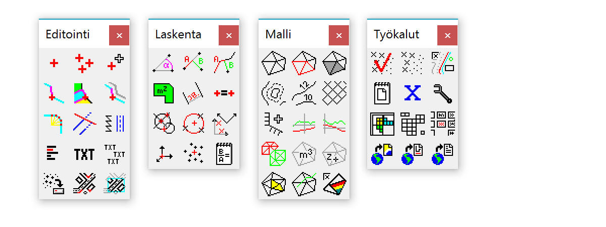 Käytössäsi on yksitoista palettia: Tulostus, Zoomaus, Editointi, Laskenta, Maastomalli, Tiegeometria, Kairaus, Työkalut ja kolmen omaa. Työkalupalettien sisältöä voidaan editoida Työpöytä-asetuksissa.
