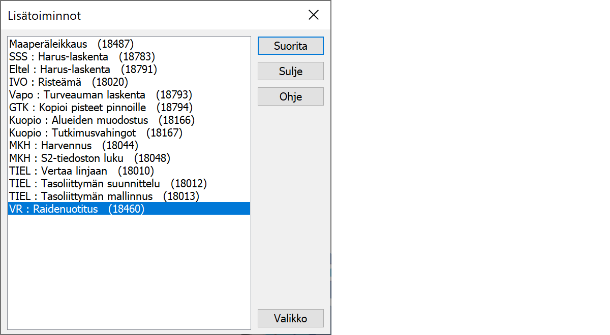 Suluissa oleva numero toiminnon perässä viittaa valikkotoiminnon parametriin, jolla toiminnon saa käynnistymään suoraan valikosta. Valikko-painike avaa valikkotoiminnon luonnin valitun funktion asetuksilla.