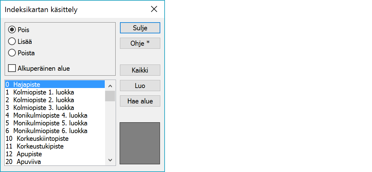 Uuden rasteroinnin lisääminen tai poistaminen indeksikartasta. Vaihtoehto Pois ei tee mitään.