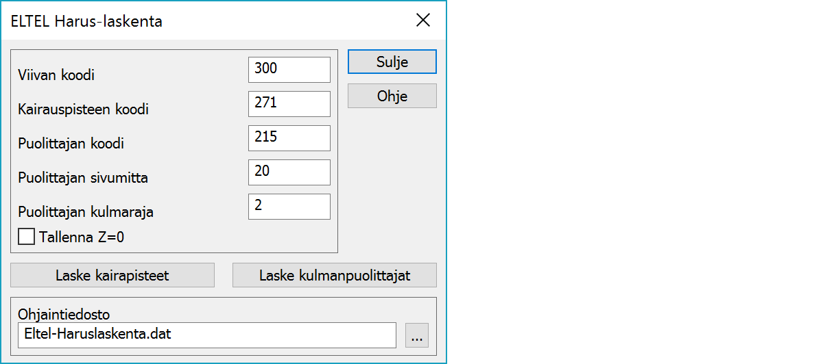 Laskee kairapisteet ja tallettaa ne aktiiviseen tiedostoon. Oletuksena lasketaan kaikki pisteet alueen sisälle, Shift-näppäimen kanssa vain kulmiin.