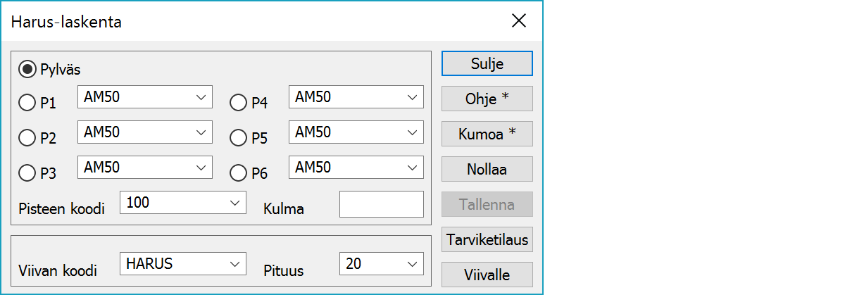 Osoita ensin laskettava tolppa hakutavalla Lähin piste ja sitten tolppaan liittyvät johdot (P1-P6). Toiminto laskee haruksen suunnan ja näyttää sen ruudussa. Haruksen suuntakulma näytetään Kulma-kentässä.